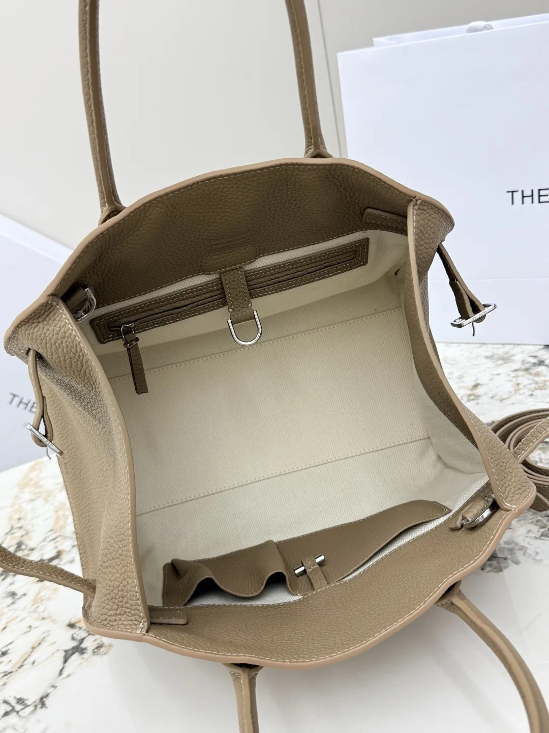 Lychee grain (small size 32CM) The Row boutique hot-selling classic tote bag Soft Margaux 12-inch series, made of lychee grain calfskin, ultra-large capacity lightweight handbag, simple yet understated, featuring full steel silver hardware. The bag is made of imported lychee grain leather, with a soft and excellent touch, gathered strap with accordion-style sides, interior with a slide buckle closure, one zip pocket, two slip pockets, and comes with a shoulder strap for crossbody wear. Model: T1586. Dimensions: Length 32cm x Width 19cm x Height 23cm!
