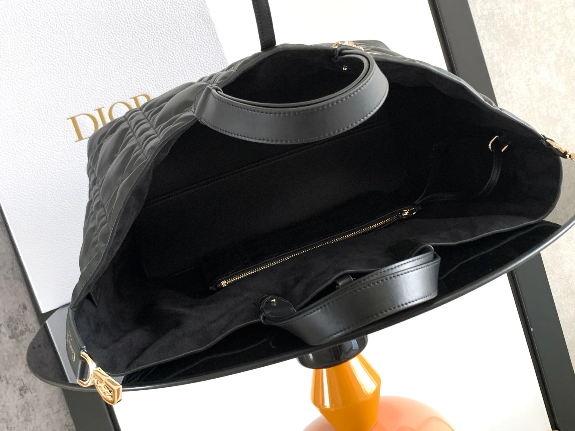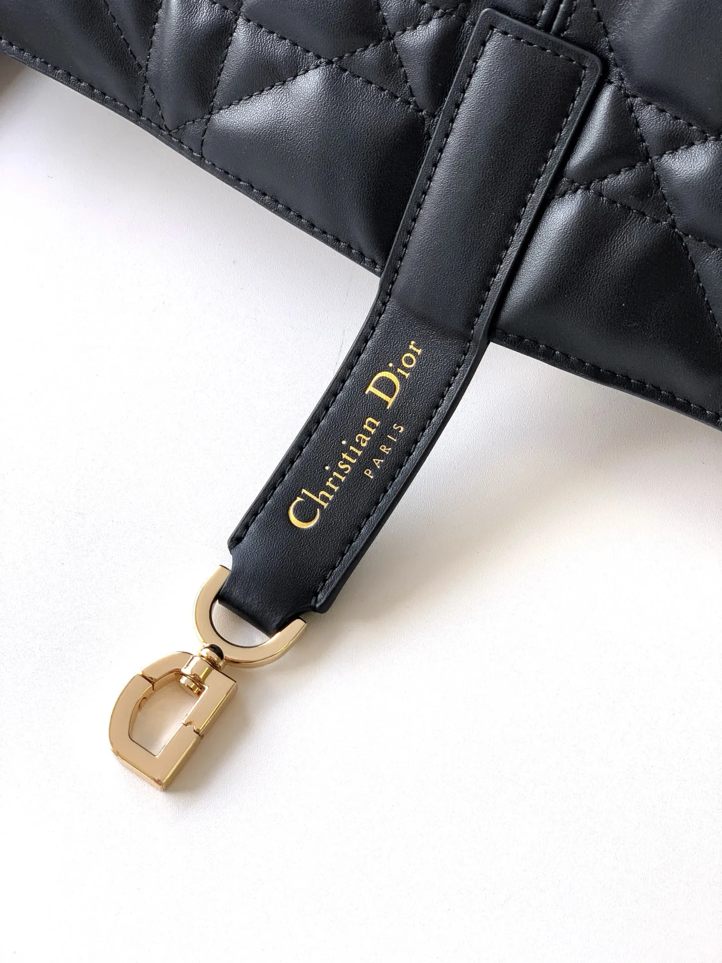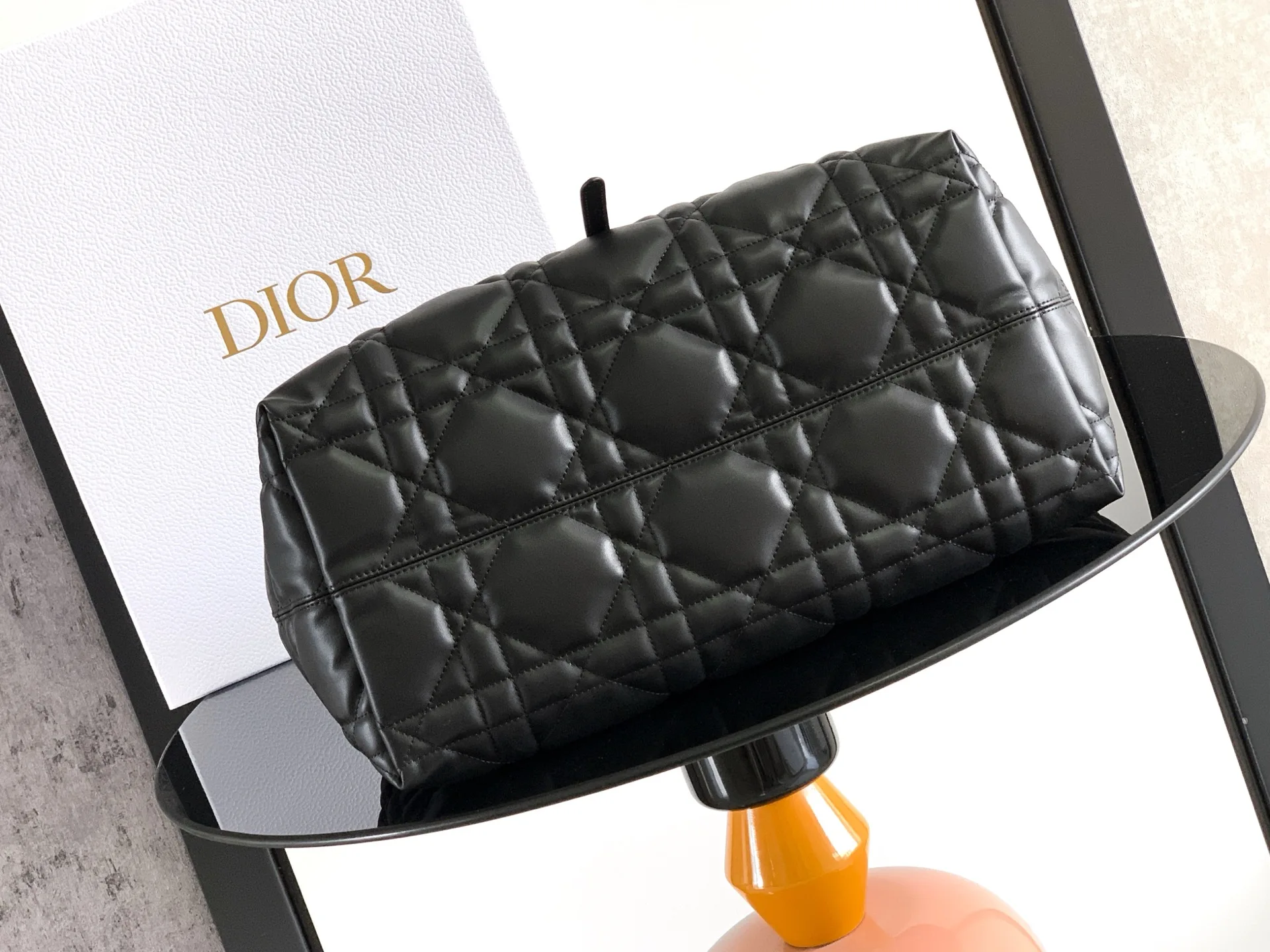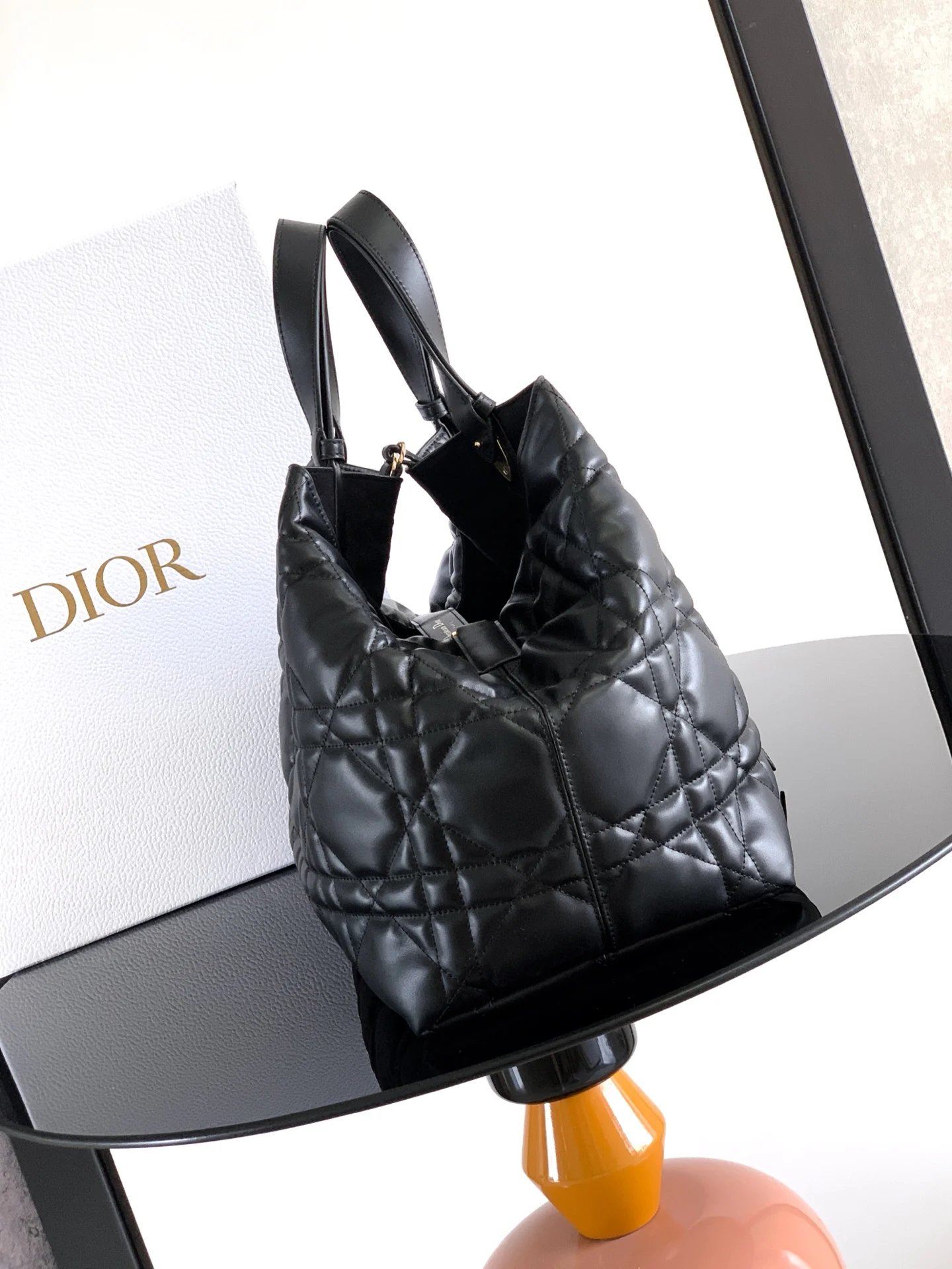 The Dior Toujours bag is a study in relaxed practicality and singular style. Crafted in black calfskin with oversized Cannage stitching, the spacious interior compartment features a pouch to neatly organize daily essentials. The bag is further enhanced by thin leather ties for secure closure and a CD Lock, with a D twist clasp, to adjust the sides and lend it a distinctive silhouette. The large style features a top leather handle with adjustable detailing, allowing the bag to be carried by hand or worn over the shoulder.- Body: Calfskin- Lining: Suede calfskin and calfskin- Double closure: Thin ties and Christian Dior Paris ties with CD Lock clasp- D.I.O.R. charm- Removable interior pouch- Adjustable top leather handle- Dimensions: 37 x 27 x 21 cm- Reference: M2820OSHJ