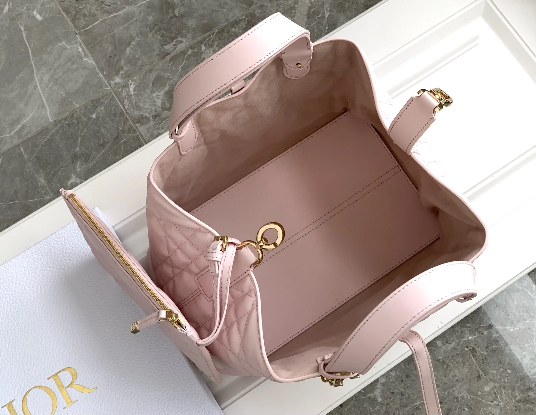 Unveiled at the Dior Spring-Summer 2023 ready-to-wear show, the Dior Toujours bag stands out with its casual and practical design. Crafted in pink calfskin with oversized Cannage stitching, the spacious interior compartment features a pouch to neatly organize daily essentials. The thin leather strap closure ensures the safety of belongings, while the CD Lock D-twist clasp allows for adjusting the sides, enhancing its style. The medium-sized bag features an adjustable leather handle for hand or shoulder carry.* Double closure: thin strap and Christian Dior Paris strap with CD Lock clasp* D.I.O.R. charm* Removable interior pouch* Adjustable leather handle* Dust bag included* Made in Italy* Model: 2821* Dimensions: 28.5 x 21.5 x 17 cm (Length x Height x Width)* Can hold 2 pouches, 1 phone, 2 card holders, sunglasses and a lipstick