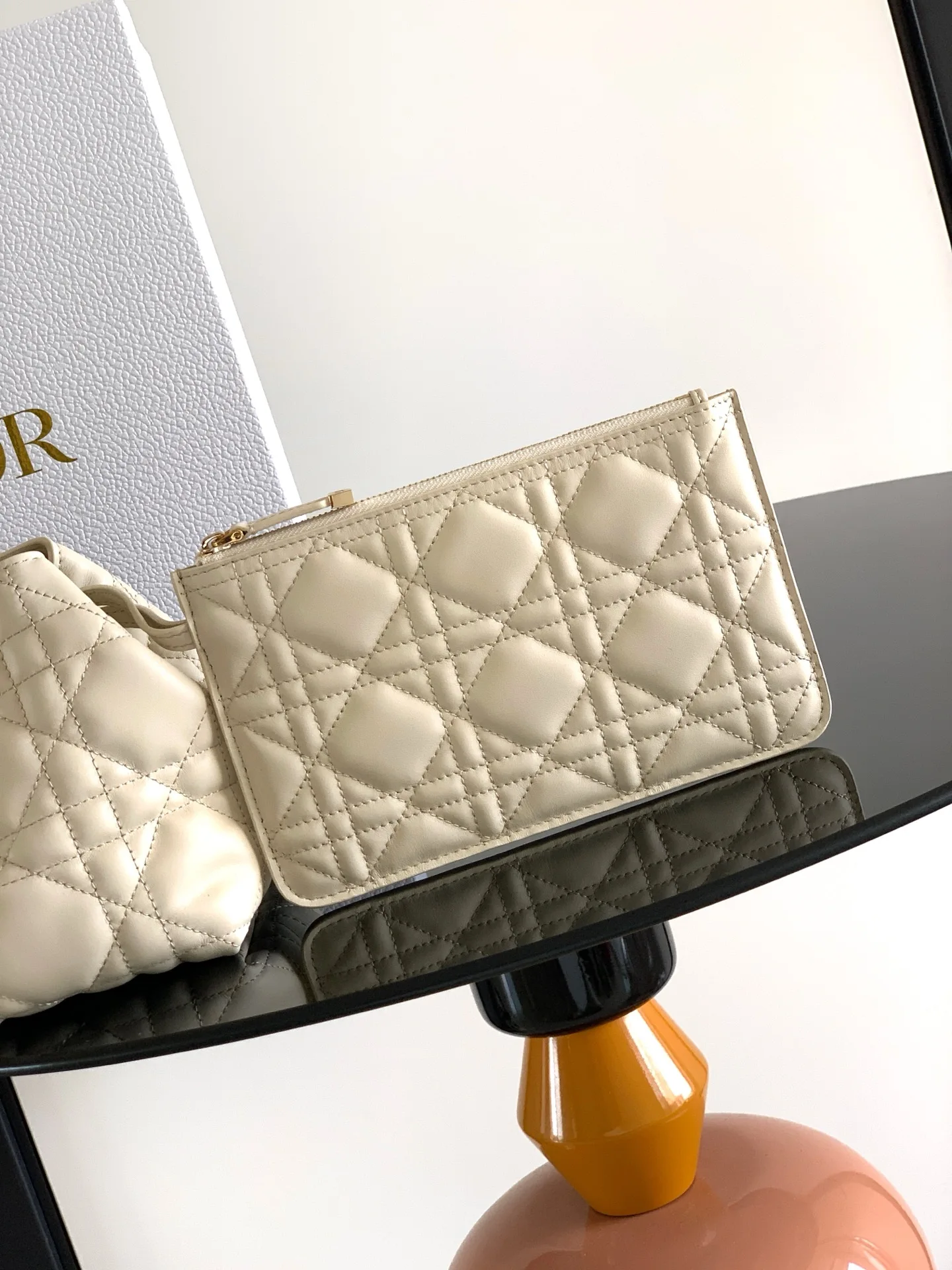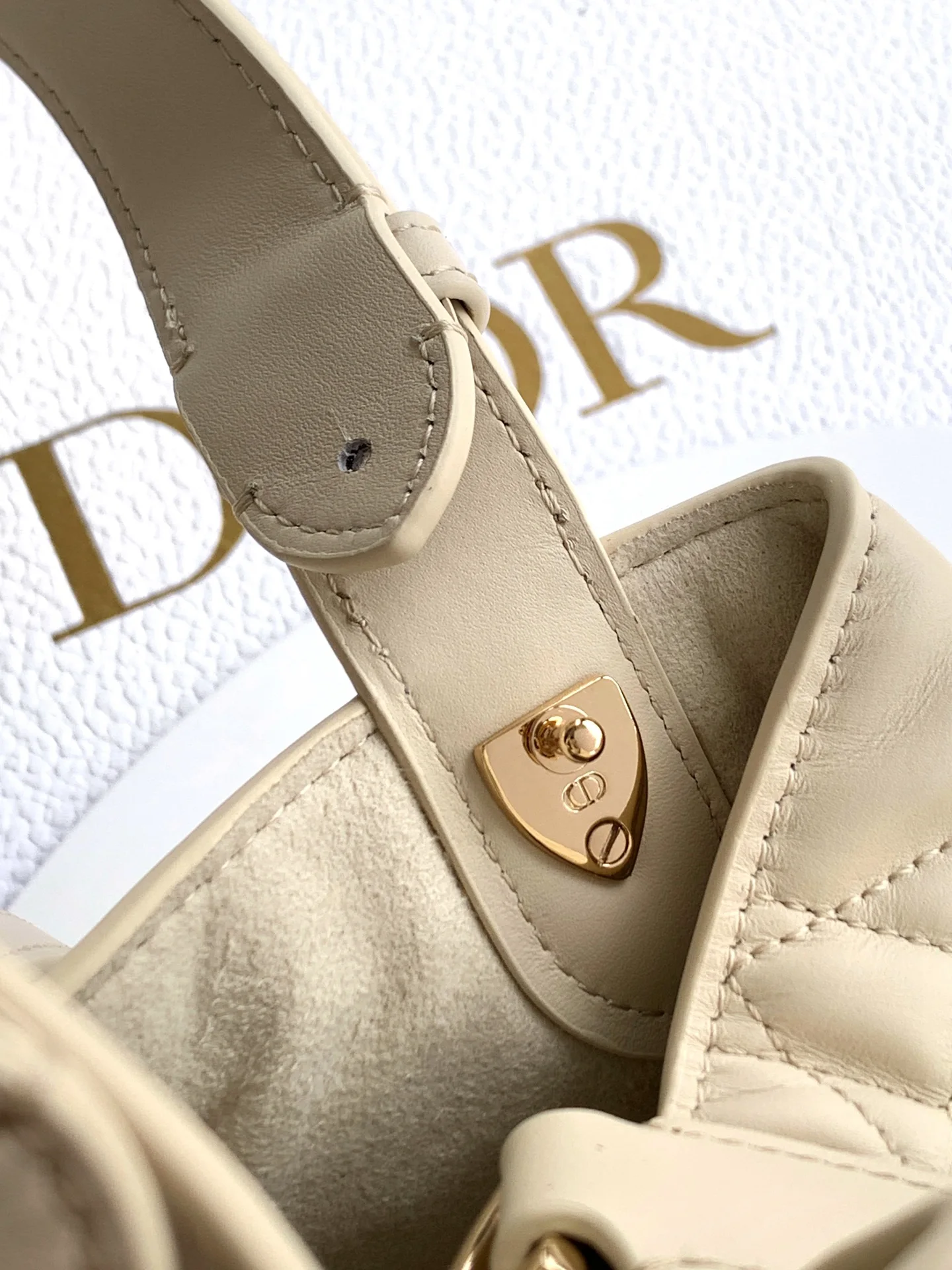 The small, latte-colored Dior Toujours bag, presented at the Spring-Summer 2023 fashion show, stands out with its casual and practical design. Crafted in black calfskin with oversized Cannage stitching, the spacious interior compartment features a pouch for organizing daily essentials. A leather strap closure secures belongings, while the CD Lock D twist clasp allows for adjusting the sides, enhancing its style. The small size and adjustable leather handles allow for easy hand carrying. It features a double closure: thin straps and a Christian Dior Paris strap with a CD Lock clasp. The D.I.O.R. charm is detachable, and it includes a removable interior pouch and adjustable leather handles. A dust bag is included. Made in Italy. Reference: 2822. Dimensions: 23 x 14 x 12 cm (Length x Height x Width). It can hold a phone, two card holders, sunglasses, and lipstick.