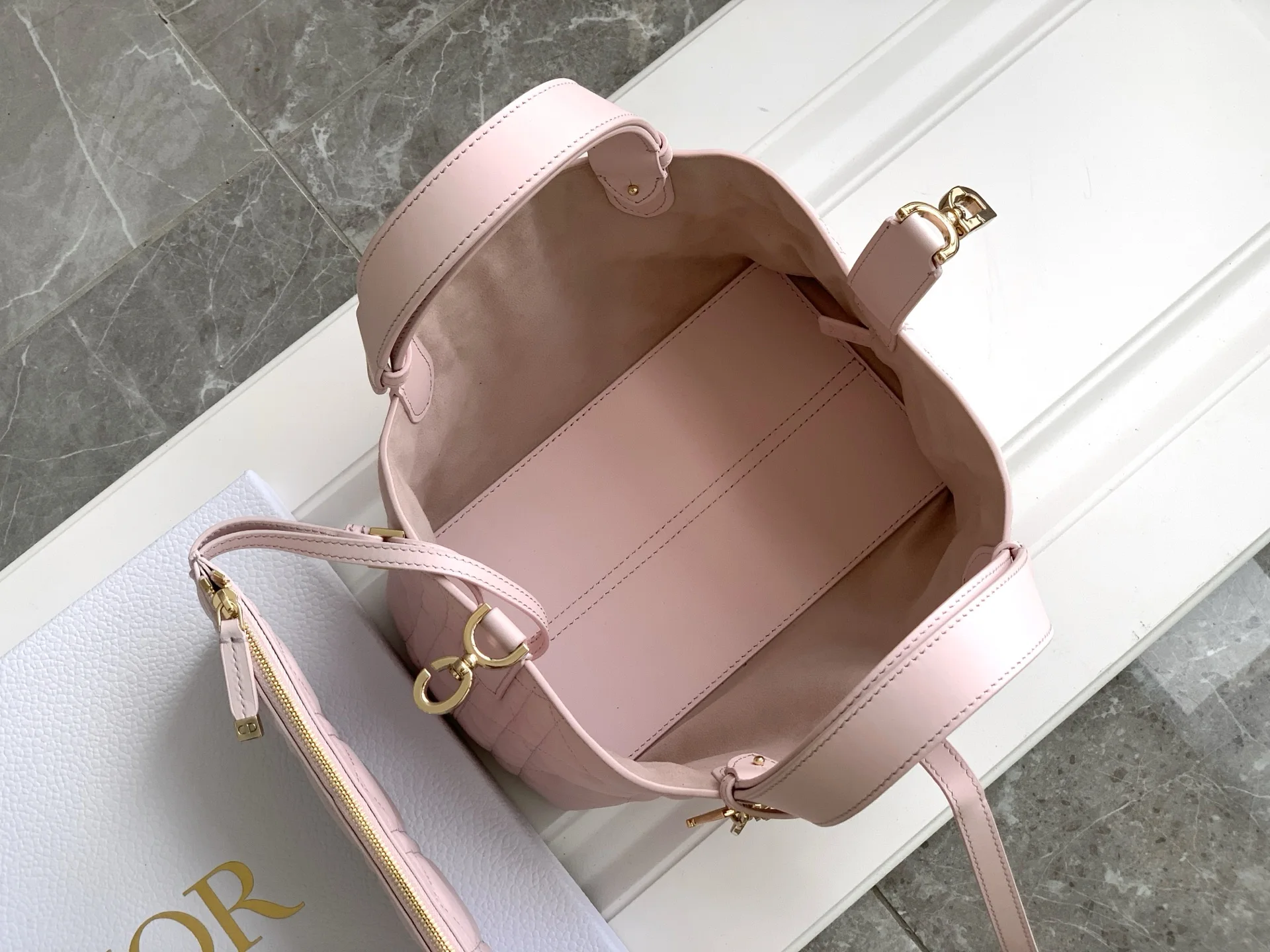 The Dior Toujours bag, unveiled at the Spring-Summer 2023 fashion show, stands out with its casual and practical design. Crafted in pink calfskin with oversized Cannage stitching, the spacious interior compartment features a pouch for organizing daily essentials. A leather tie closure secures belongings, while the CD Lock D-twist clasp allows for adjusting the sides, enhancing its style. The small style features an adjustable leather handle for easy hand carry.* Double closure: thin leather ties and Christian Dior Paris ties with CD Lock clasp* D.I.O.R. charm* Removable interior pouch* Adjustable leather handle* Dust bag included* Made in Italy* Reference: 2822* Dimensions: 23 x 14 x 12 cm (L x H x W)* The size is suitable for a phone, 2 card holders, sunglasses and a lipstick