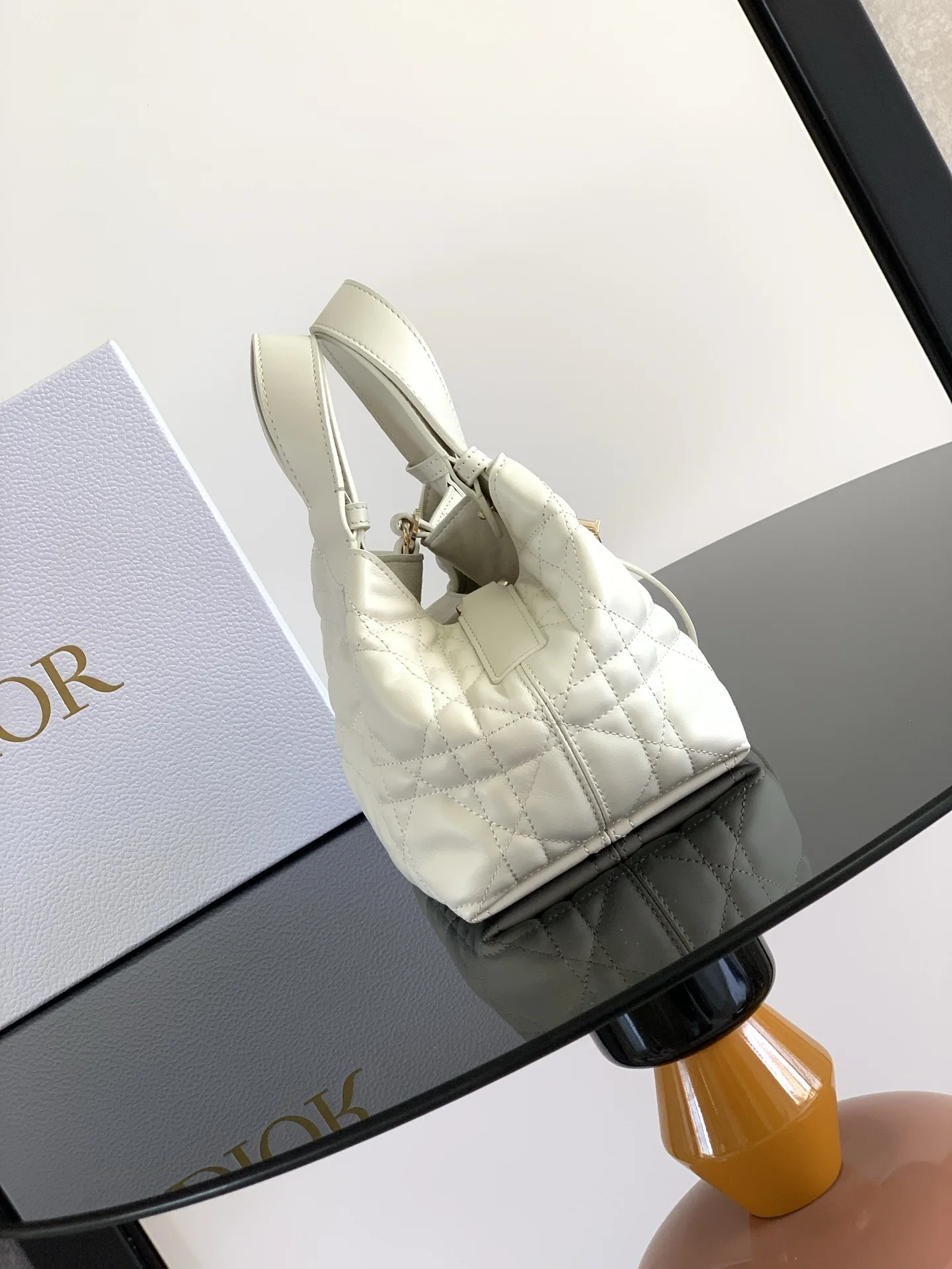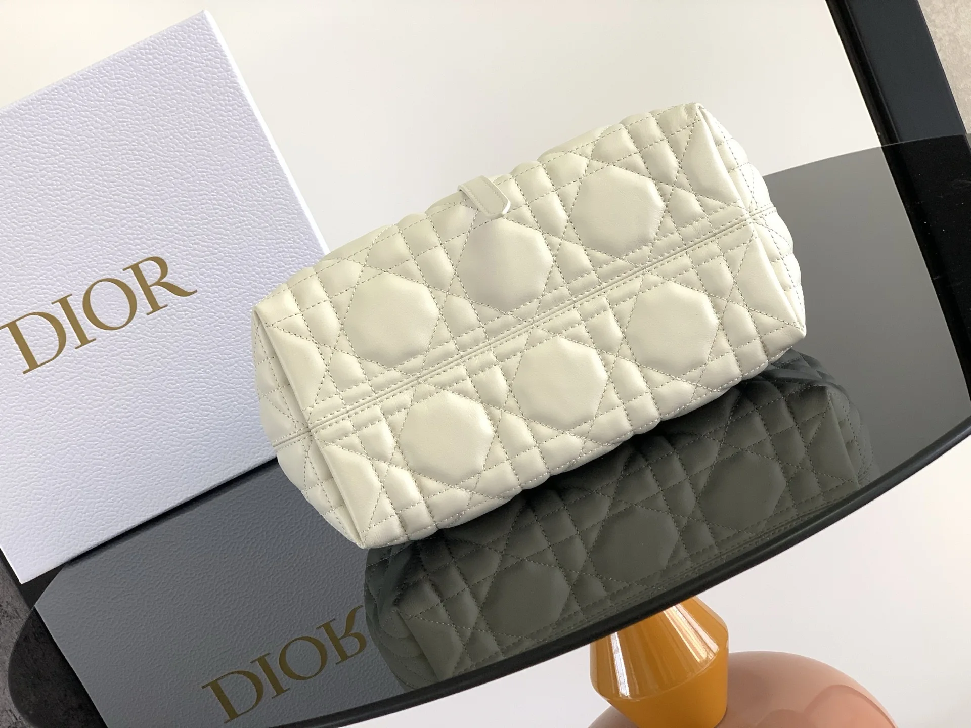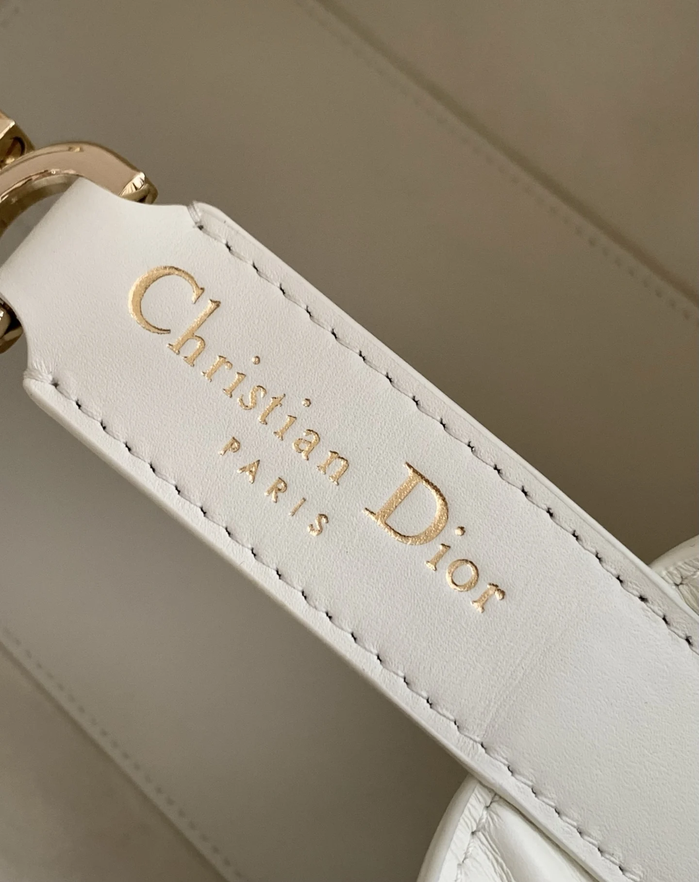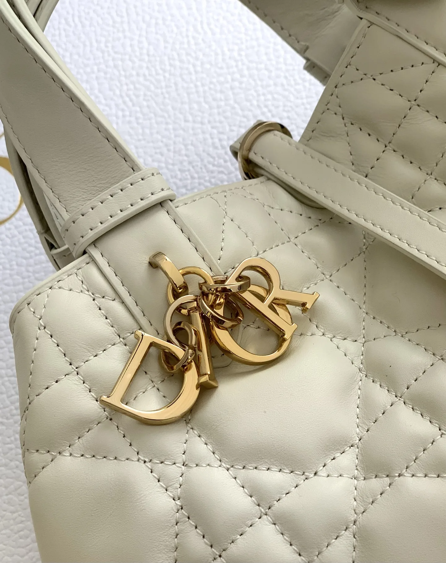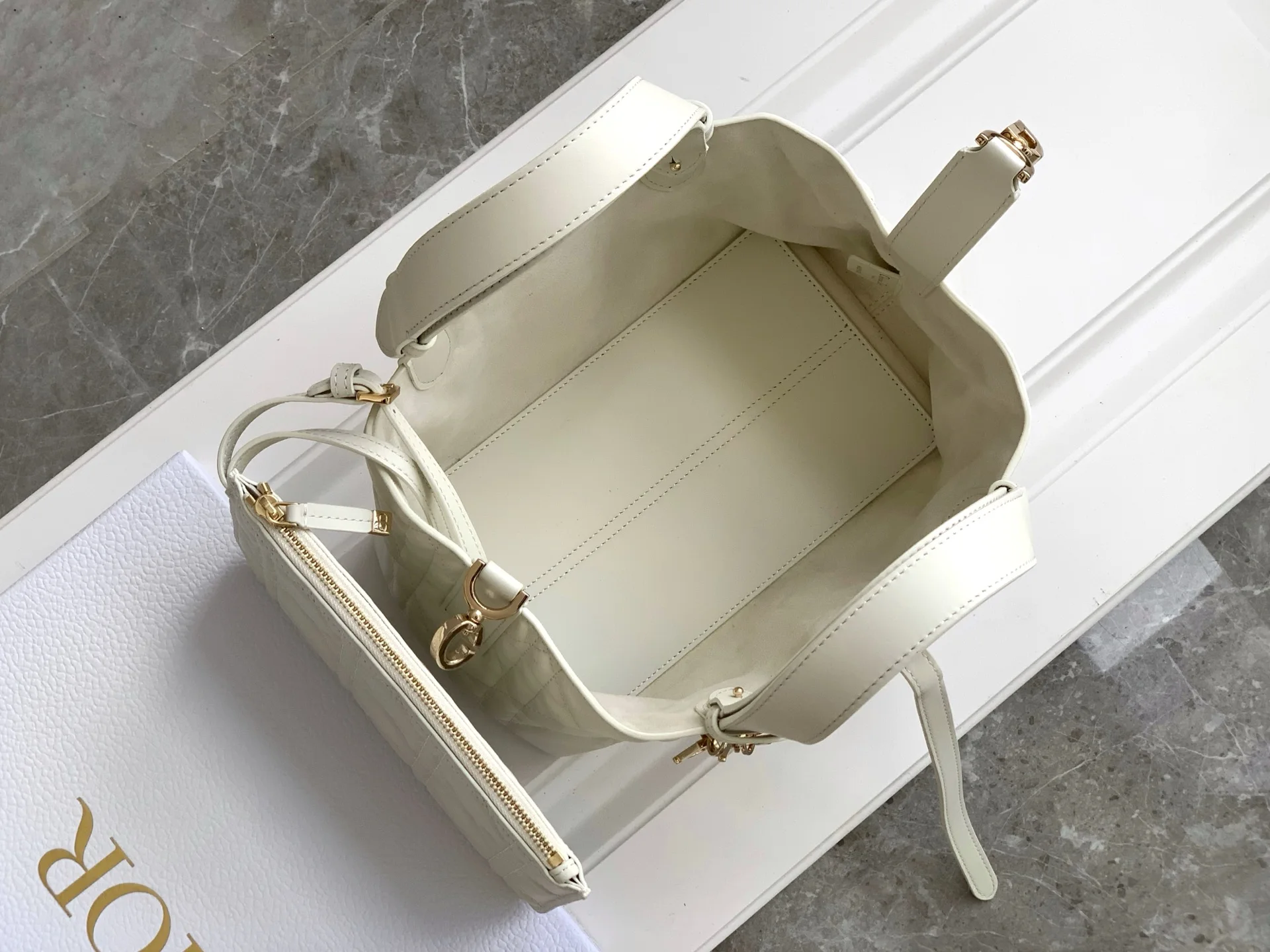 Unveiled at the Spring-Summer 2023 show, the Dior Toujours bag stands out with its casual and practical design. Crafted in white calfskin with oversized Cannage stitching, the spacious interior compartment features a pouch to neatly organize daily essentials. A leather strap closure secures belongings, while the CD Lock adds a touch of sophistication with its adjustable sides. The small style features an adjustable leather handle for easy hand carry.* Dual closure: thin strap and Christian Dior Paris strap with CD Lock* D.I.O.R. charms* Removable interior pouch* Adjustable leather handle* Dust bag included* Made in Italy* Reference: 2822* Dimensions: 23 x 14 x 12 cm (L x H x W)* The size is suitable for a phone, 2 card holders, sunglasses and a lipstick