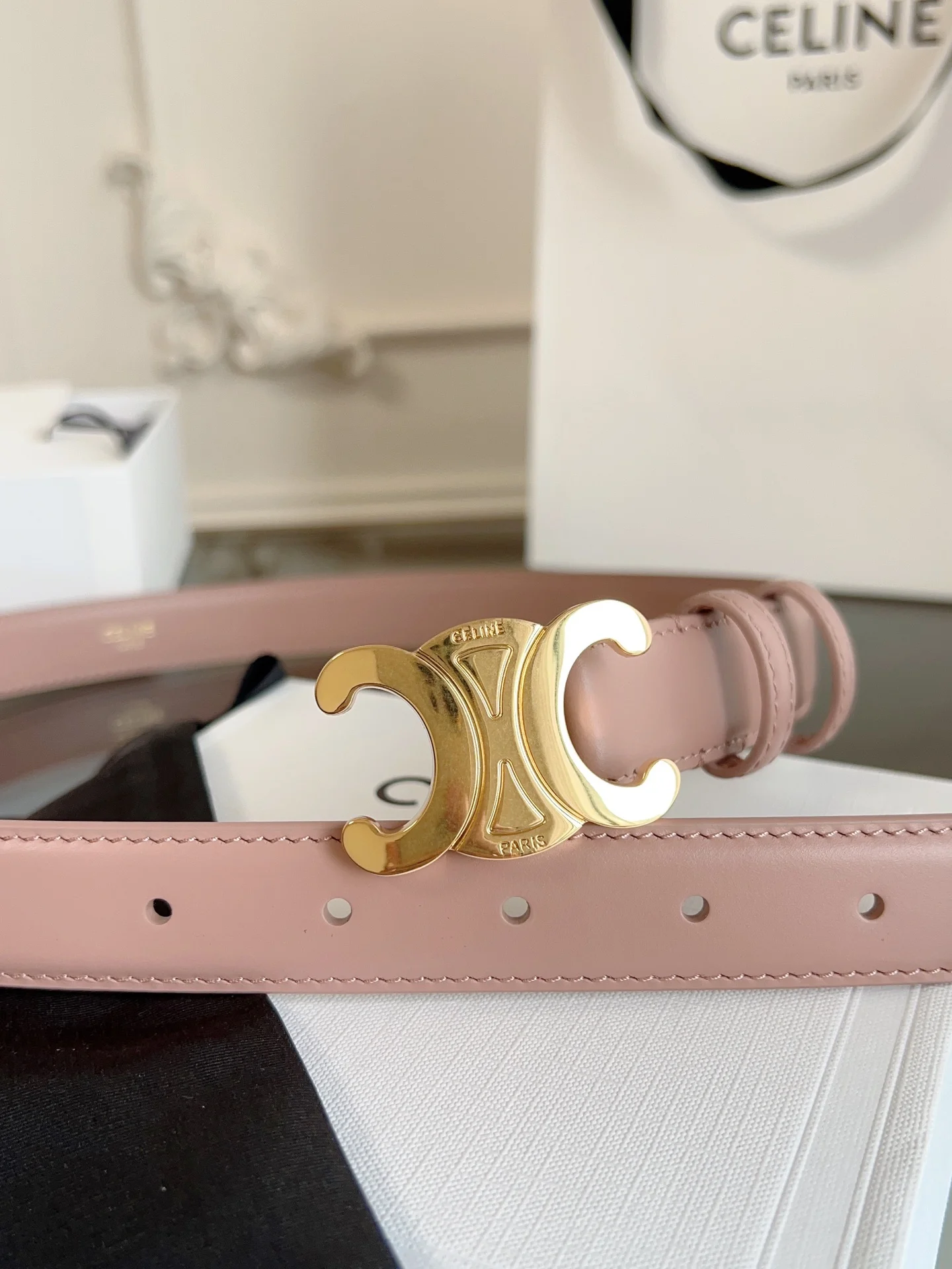 CELINE women s belt, crafted from calfskin leather and featuring a unique Triomphe buckle. In a pink hue with a width of 2.5cm, it subtly exudes luxury and effortlessly enha..