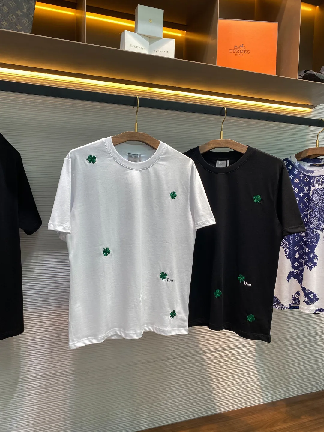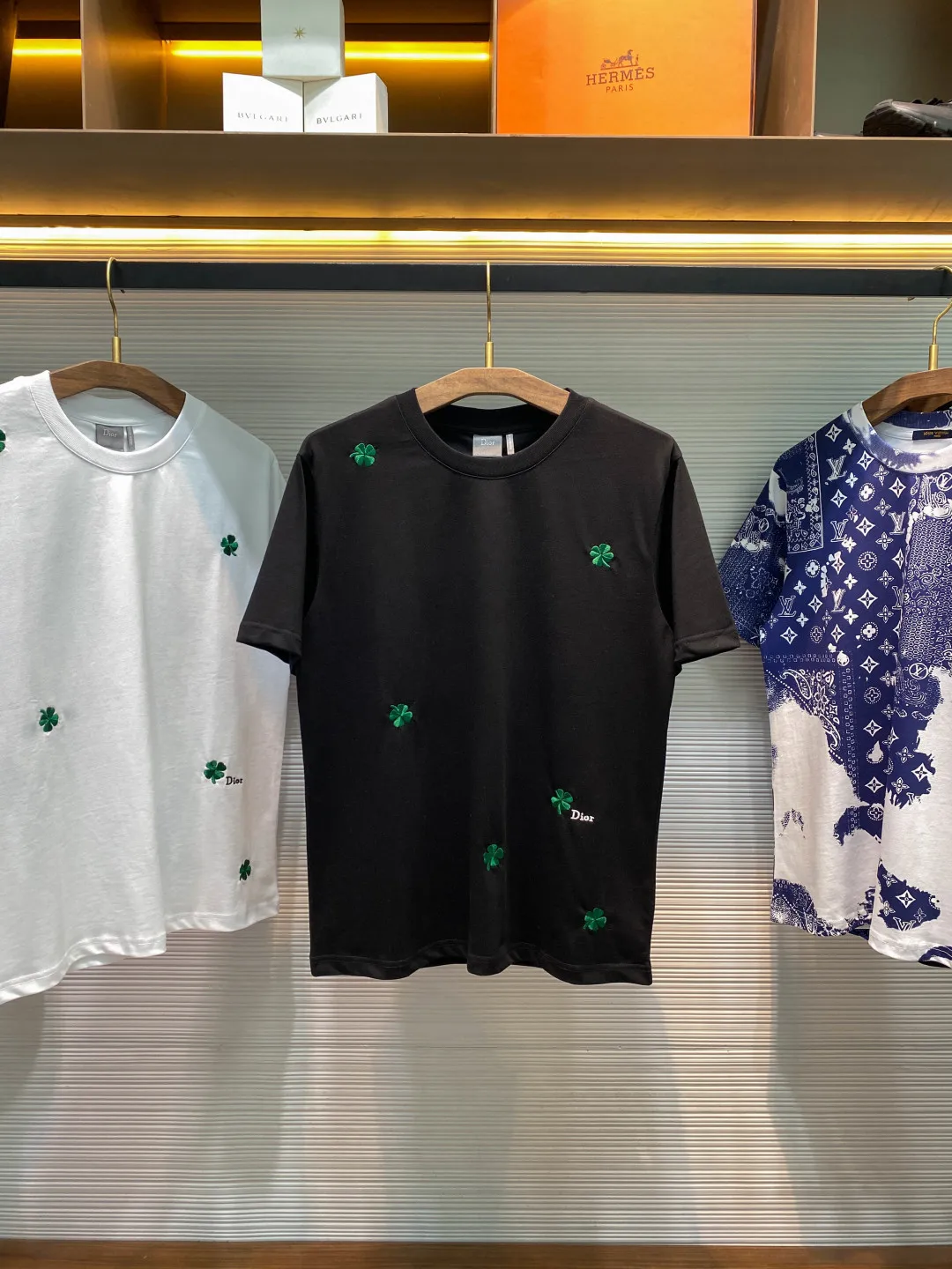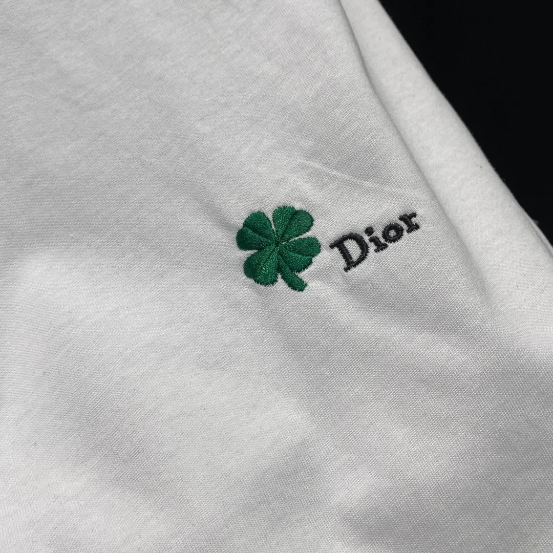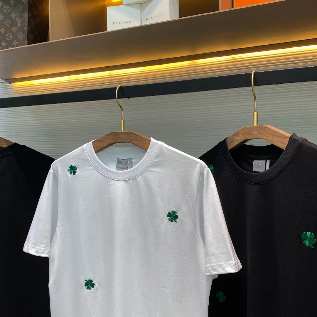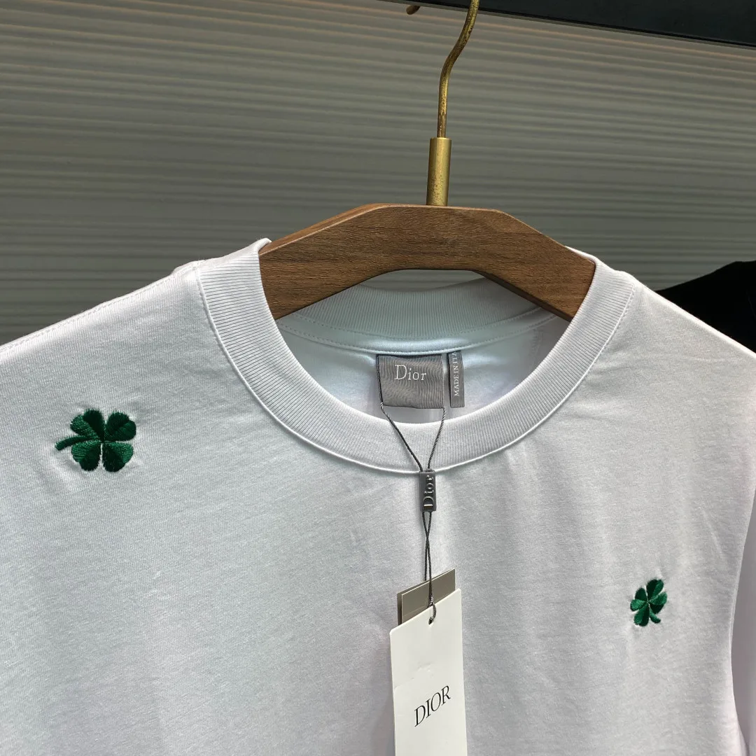 Dior Unisex Full-Width Green Four-Leaf Clover Pattern Embroidered Casual Short Sleeve T-Shirt