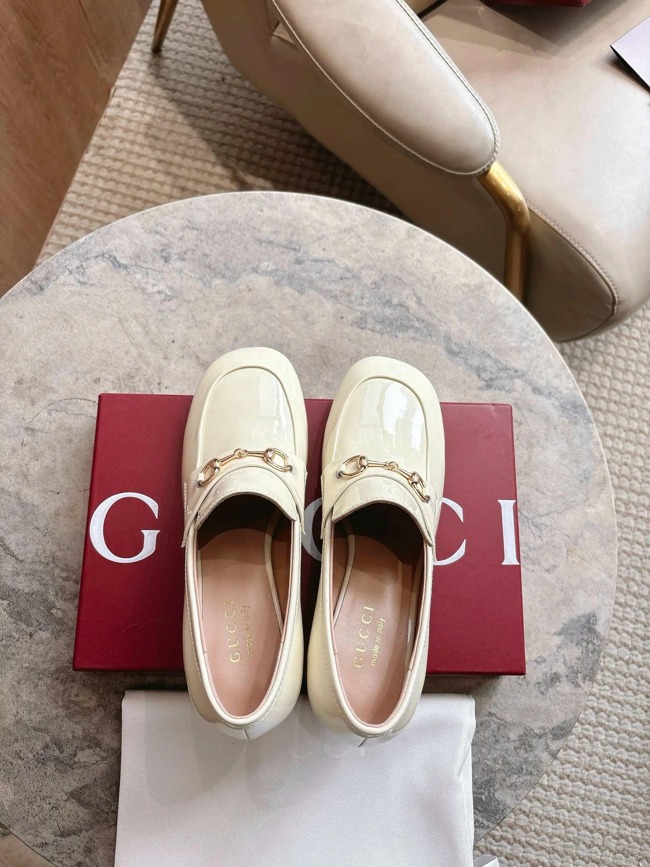 A tribute to the brand s equestrian roots, the G Carrefour loafer (sizes 35-42) in customized sizes 40, 41, and 42 features the Horsebit, which has stood the test of time, blending a rich historical heritage with modern style. This women s loafer is crafted from soft, shiny patent leather.